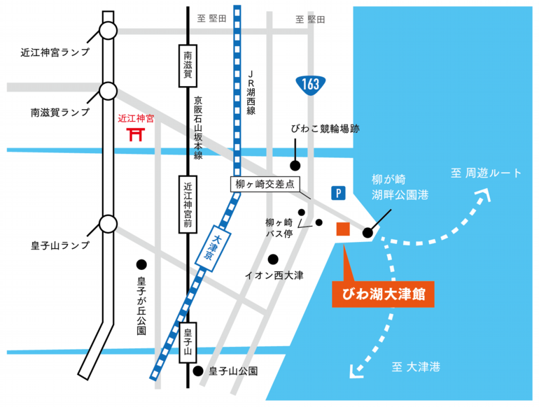 大津港から遊覧船で約60分(柳が崎湖畔公園港下船)※大津港へは京阪・浜大津駅から徒歩約3分です。