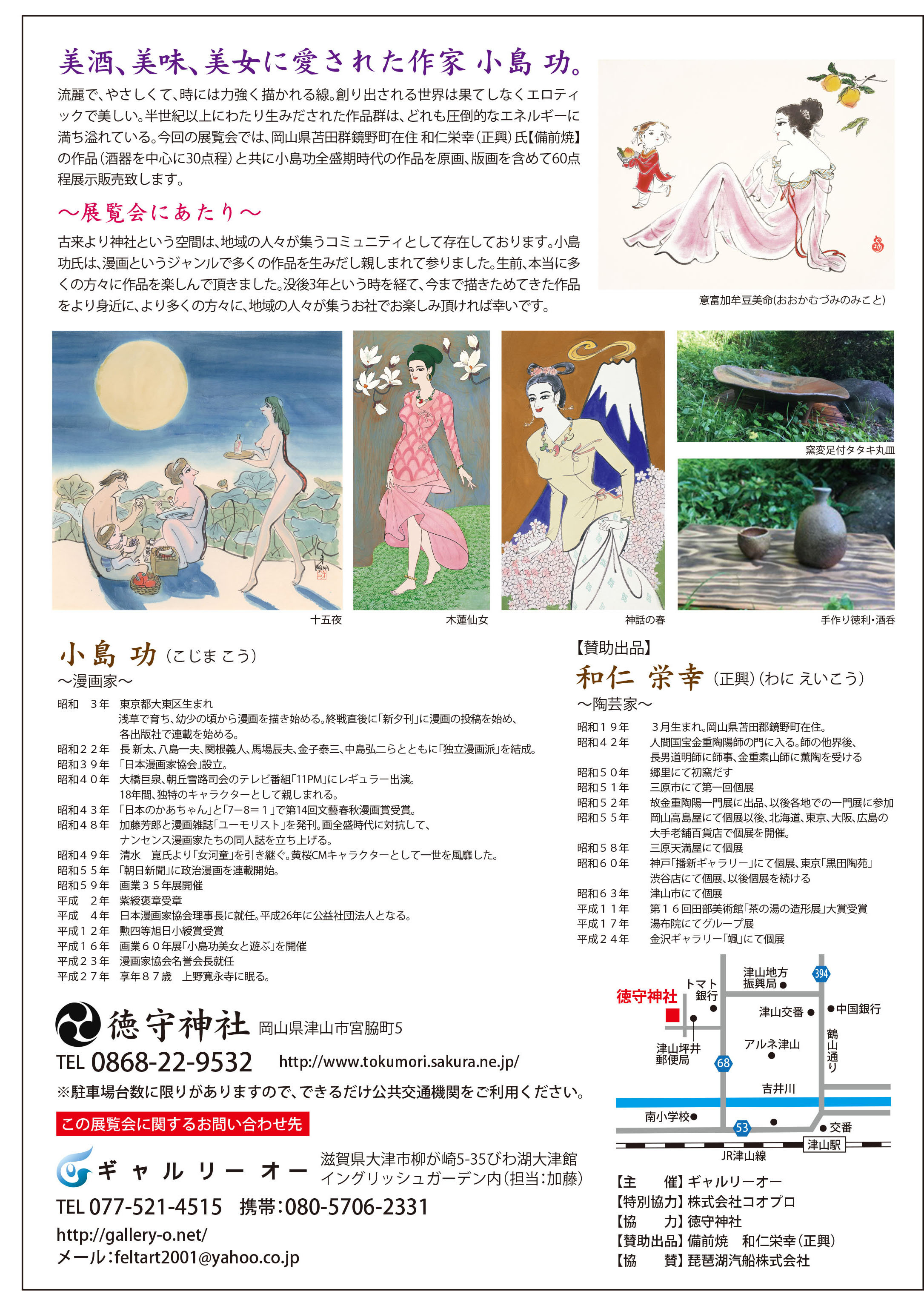 今回の展覧会では、岡山県苫田郡鏡野町在住 和仁栄幸(正興)氏【備前焼】の作品(酒器を中心に30点程)と共に小島功全盛期時代の作品を原画、版画を含めて60点程展示販売致します。