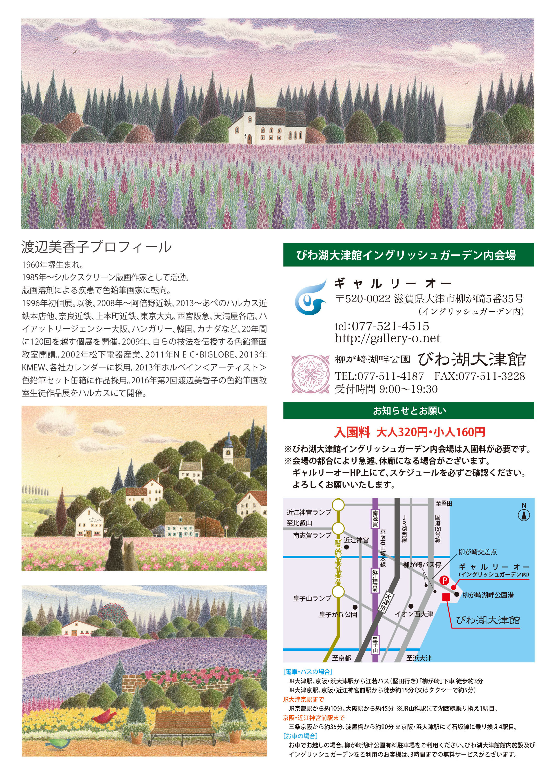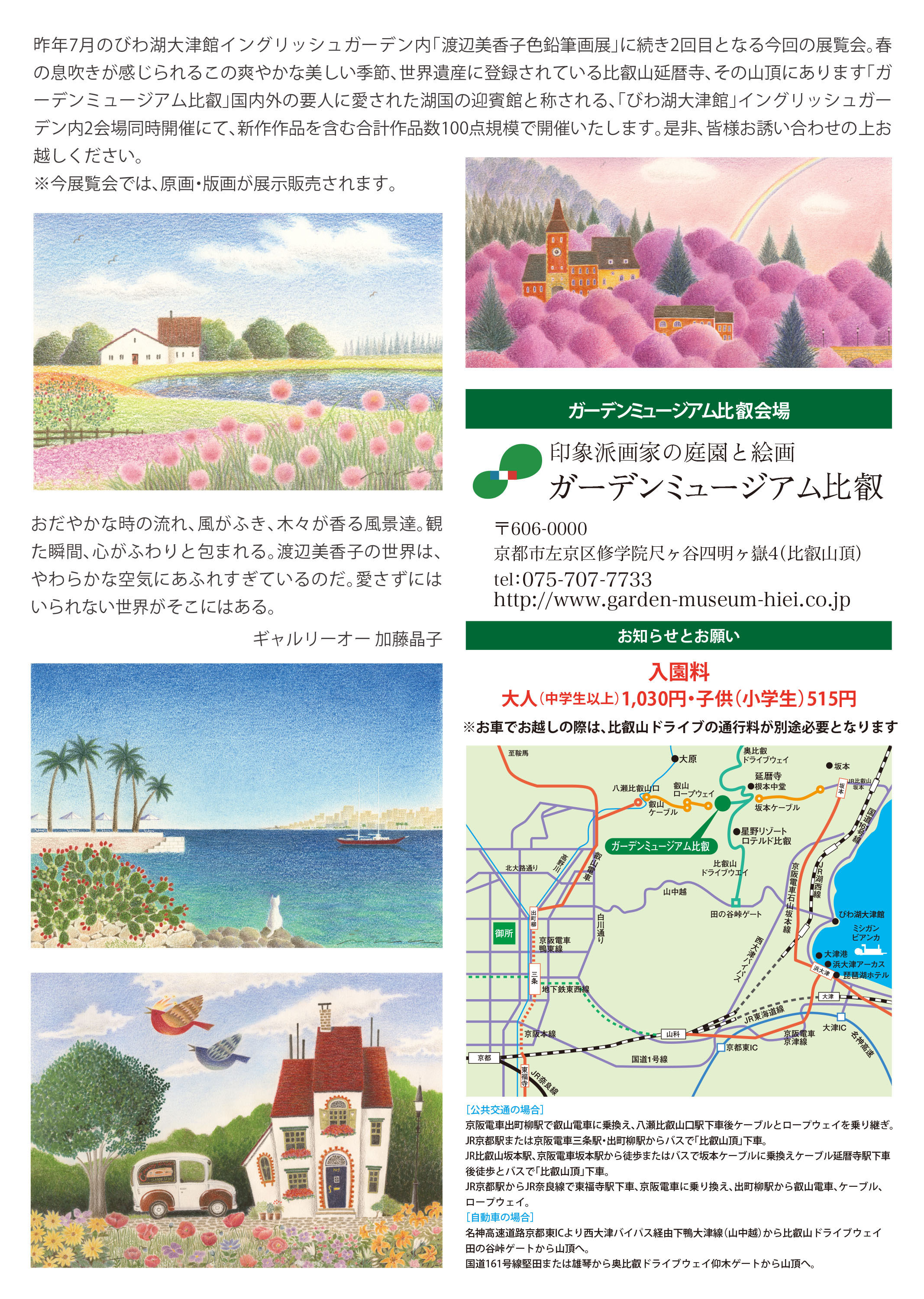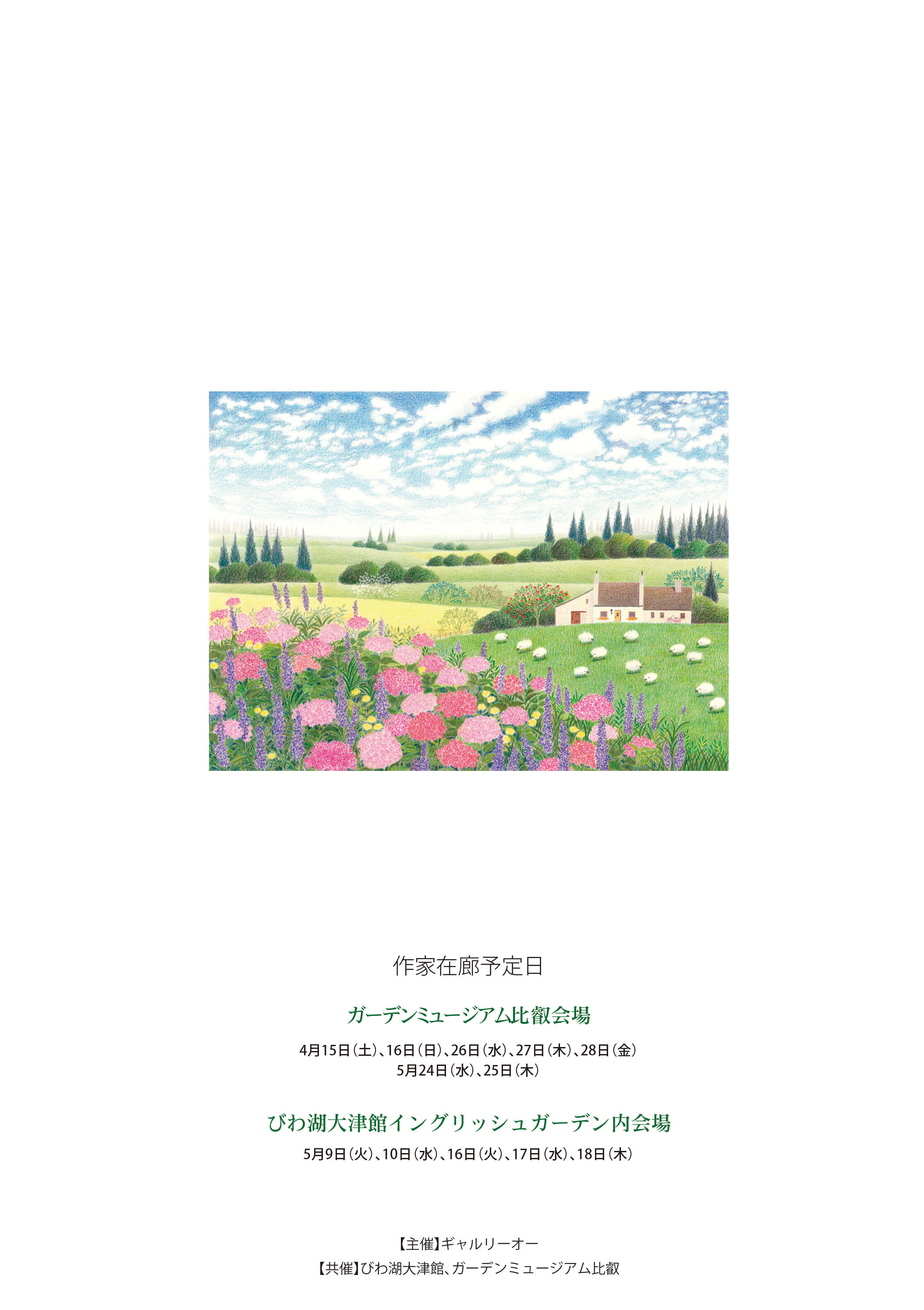 昨年7月の びわ湖大津館イングリッシュガーデン内「渡辺美香子色鉛筆画展」に続き 2回目となる今回の展覧会。 春の息吹きが感じられるこの爽やかな美しい季節、 世界遺産に登録されている比叡山内にある「ガーデンミュージアム比叡」と 、 国内外の要人に愛された湖国の迎賓館と称される「びわ湖大津館」イングリッシュガーデン内 2会場同時開催にて、 新作作品を含む合計作品数100点規模で開催いたします。 是非、皆様お誘い合わせの上お越しください。 ※今展覧会では、原画・版画が展示販売されます。