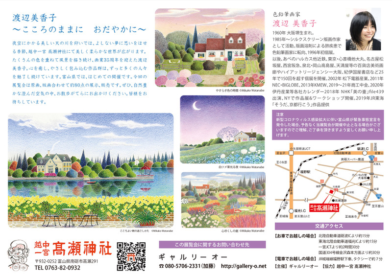 富山県では、はじめての開催です。今回の展覧会は原画、版画合わせて約80点の展示、販売です。ぜひ、自然豊かな澄んだ空気の中、お散歩がてらにお出かけください。