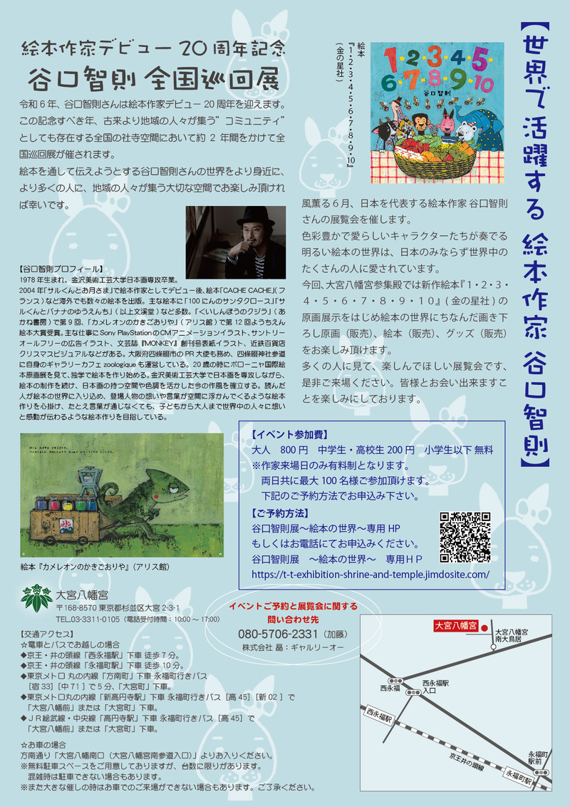 今回、大宮八幡宮参集殿では新作絵本『1・2・3・4・5・6・7・8・9・10』(金の星社)の原画展示をはじめ絵本の世界にちなんだ画き下ろし原画(販売)、絵本(販売)、グッズ(販売)をお楽しみ頂けます。