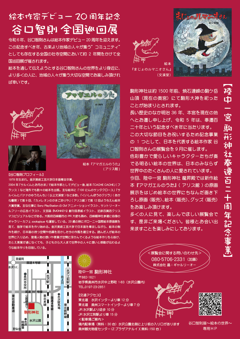 今回、陸中一宮 駒形神社 龍昇殿では新作絵本『アマガエルのうた』(アリス館)の原画展示をはじめ絵本の世界にちなんだ画き下ろし原画(販売)、